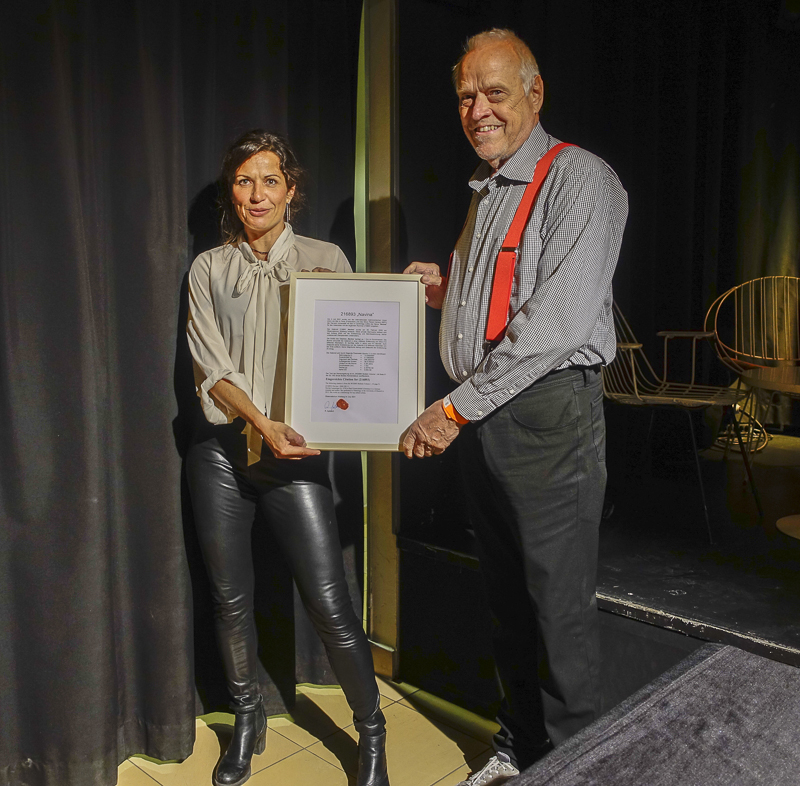 Nach Urban Priols gelungenem Bühnenprogramm "Alles im Fluss" am 30.9.2021 in Reutlingen wurde die Urkunde zur Namensgebung des Asteroiden "Navina" der Dramaturgin